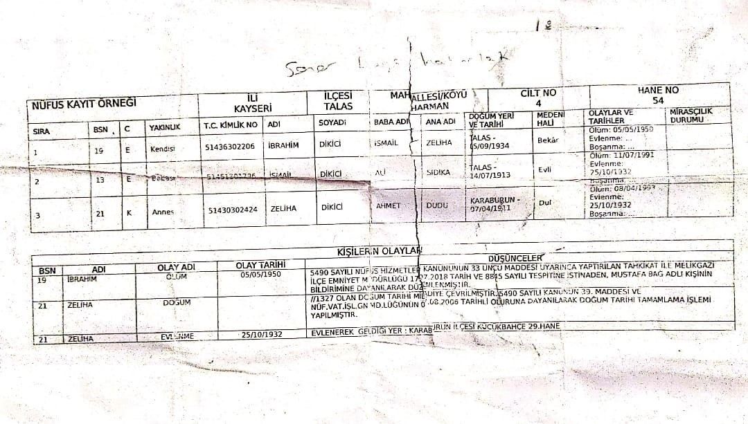 İlginç olay İzmir'de meydana geldi. 87 yaşındaki İbrahim Dikici, sağlık sorunları nedeniyle 2018 yılında hastaneye gittiğinde nüfus kayıtlarına göre ölü olduğunu öğrendi. Bunun üzerine isim ve soy ismi olmadan "adli vaka" olarak girişi yapıldı. Dikici'nin yakınları ise sorunu çözmek için araştırma yapmaya başladı. Nüfus kayıtlarında Dikici'nin 5 Mayıs 1950 tarihinde henüz 16 yaşındayken öldüğünün yazıldığı, kaydın da tanımadıkları M.B. isimli şahsın beyanı ve Kayseri Melikgazi İlçe Emniyet Müdürlüğünün yaptığı tahkikat sonucu 2018 yılında gerçekleştiği anlaşıldı. Bunun üzerine İbrahim Dikici'nin yaşadığını ispat etmek için 2 Mart 2021'de hukuk mücadelesi başlatıldı. 18 Mart 2021'de Dikici'den kan örneği alındı, anne babası ve çocukları hayatta olmadığı için mezarları açılarak DNA tespiti yapılmasına karar verildi. Ancak yaşadığını bir türlü ispat edemeyen adam, kan örneği alındığı günün gecesi böbrek yetmezliğinden hayatını kaybetti. Dikici'nin ailesi, bu kez de İbrahim Dikici'nin 1950 yılında değil, 2021 yılında öldüğünü ispat etmeye çalıştı. Cenazesi 5 gün boyunca morgda kalan Dikici, uzun uğraşlar sonucu defnedildi. Dikici'nin ailesi, aradan geçen süre zarfında bu kez de icra takibi ile sarsıldı. Hastaneye isim ve soy ismi belirtilmeden girişi yapıldığı için sosyal güvencesiz tedavi olan Dikici için hastaneden 300 bin TL'lik masraf çıkartıldı. Dikici'nin 11 mirasçısı için icra takibi başlatılırken, "iki kez ölen" Dikici'nin ailesi hem maddi hem de manevi olarak büyük mağduriyet yaşadıklarını belirtti.