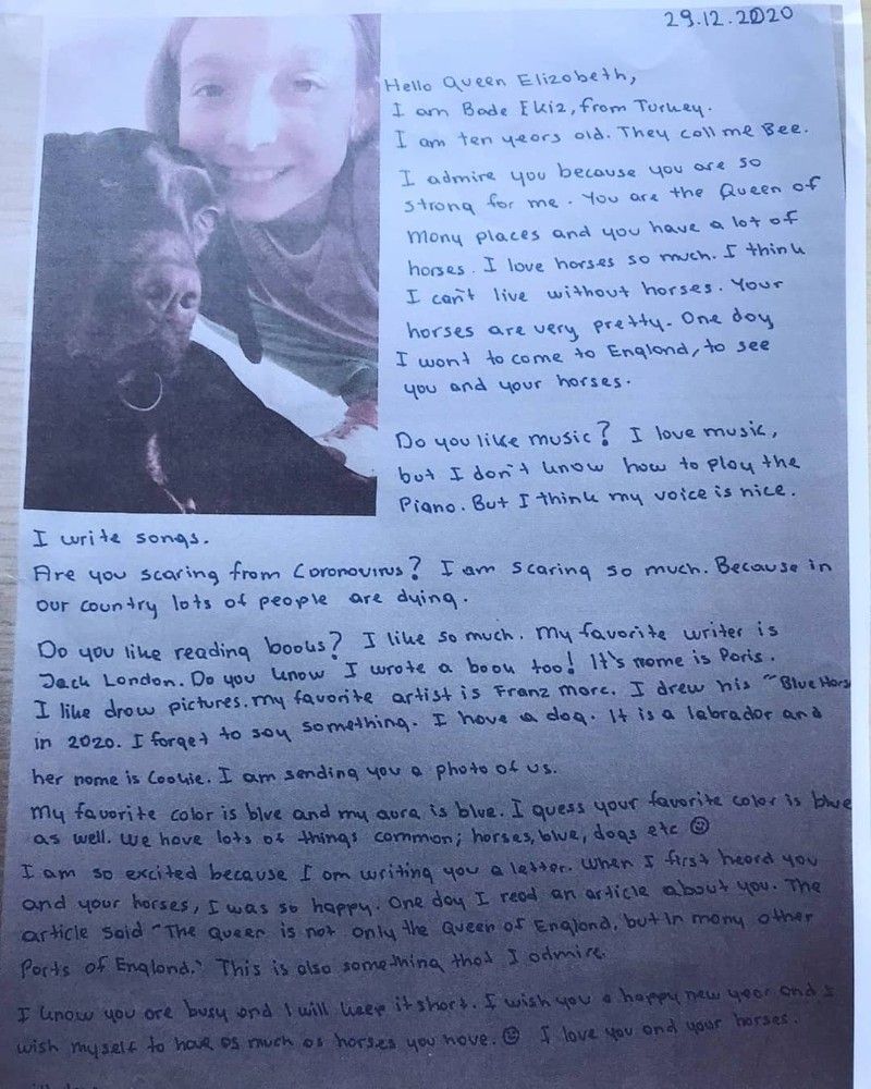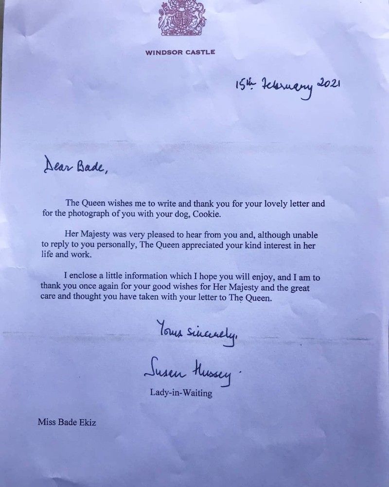 Bade Ekiz'in kişisel bilgilerini paylaştığı ve kraliçe hakkında merak ettiği soruları yazdığı mektuba cevap Windsor Sarayı'ndan gecikmedi. Kraliçenin en yakın nedimesi kraliçe adına mektuba cevap vererek Başak koleji öğrencisinin Kraliçe Elizabeth'e olan ilgisinden çok memnun kaldıklarını belirtti. Öğrenci Bade Ekiz'in köpeğiyle fotoğrafını da eklediği mektubun kendilerinde büyük bir memnuniyet oluşturduğunu ve kraliçe hakkında iyi dilekleri için de teşekkürlerini iletti.