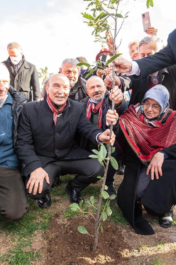 Konuşmaların ardından Başkan Soyer ile eşi Neptün Soyer, törene katılanlarla birlikte Turuncu Bahçe'ye fidan dikti.