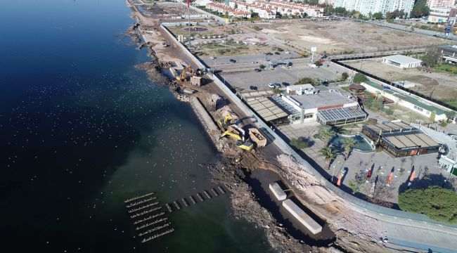 İzmir'in Karşıyaka ilçesinde sağanak yağışlardan dolayı denizin taşarak çok sayıda site bahçesi, bazı dükkanlar ve araçların su altında kalmasının ardından yeni bir taşkına karşı sahil bandına yaklaşık 2 kilometre kumdan set oluşturuldu.