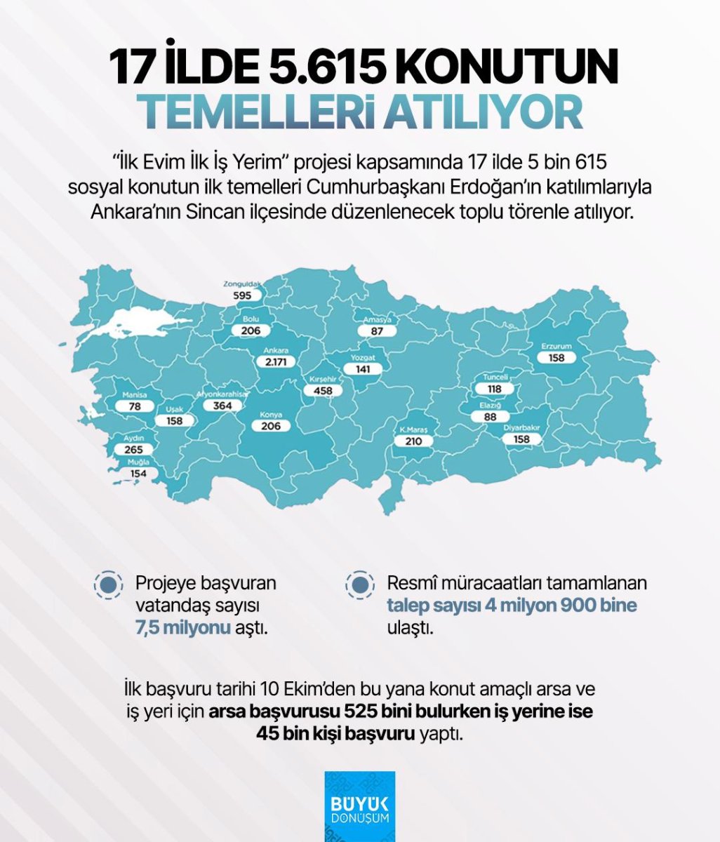 Cumhuriyet tarihinin en büyük sosyal konut hamlesi "İlk Evim İlk İş Yerim" projesi kapsamında 17 ilde, 5 bin 615 sosyal konutun ilk temelleri bugün törenle atılacak.