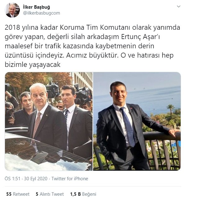 İlker Başbuğ, sosyal medya hesabından yayımladığı mesajda “2018 yılına kadar Koruma Tim Komutanı olarak yanımda görev yapan, değerli silah arkadaşım Ertunç Aşar’ı maalesef bir trafik kazasında kaybetmenin derin üzüntüsü içindeyiz. Acımız büyüktür. O ve hatırası hep bizimle yaşayacak” ifadelerini kullandı.