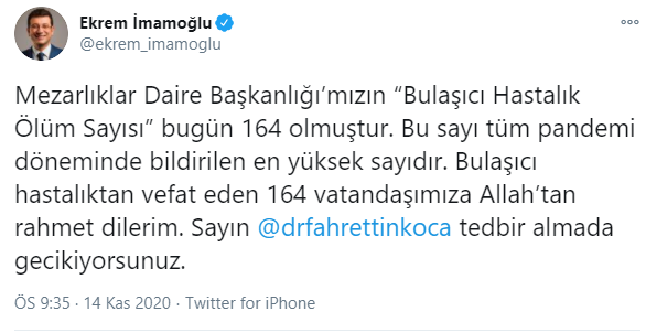 Sağlık Bakanlığı koronavirüsten bugün ölenlerin sayısını 92 olarak açıklamıştı."Mezarlıklar Daire Başkanlığı’mızın “Bulaşıcı Hastalık Ölüm Sayısı” bugün 164 olmuştur. Bu sayı tüm pandemi döneminde bildirilen en yüksek sayıdır.