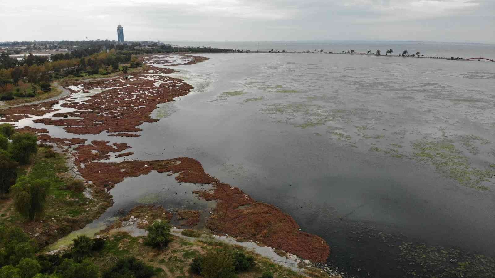 Deniz suyundaki azot ve fosfor miktarının artmasıyla meydana gelen deniz marulu, flamingolar başta olmak üzere birçok kuşun yaşadığı İnciraltı kıyılarındaki Çakalburnu Lagünü'nü yer yer örttü.