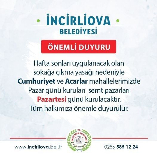 Kontrollü normalleşme süreci kapsamında 'çok yüksek riskli' iller kategorisinde yer alan Aydın'da hafta sonları uygulanan sokağa çıkma kısıtlaması getirildi. Alınan karar doğrultusunda İncirliova ilçesindeki Cumhuriyet ve Acarlar Mahallelerinde Pazar günleri kurulan semt pazarı Pazartesi'ye alındı. İncirliova Belediyesi'nden yapılan açıklamada, "Hafta sonları uygulanacak olan sokağa çıkma yasağı nedeniyle Cumhuriyet ve Acarlar Mahallelerimizde Pazar günü kurulan semt pazarları Pazartesi günü kurulacaktır. Tüm halkımıza önemle duyurulur" ifadelerine yer verildi.