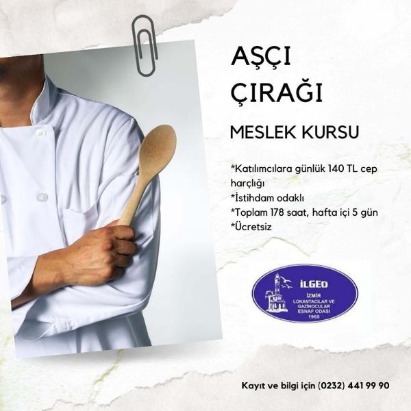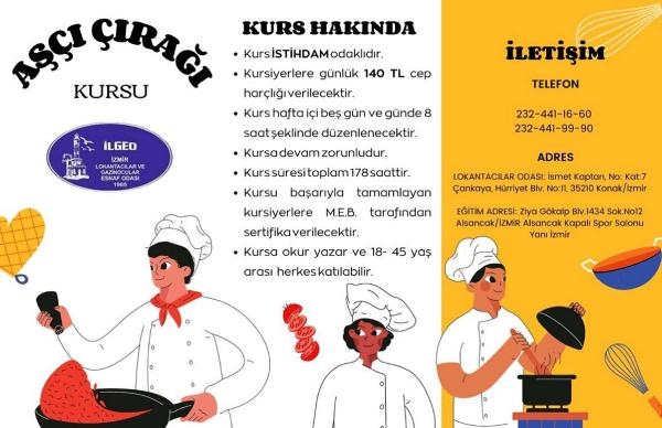 İzmir Lokantacılar Odası, 75 kişiye istihdam sağlayacak Avrupa Birliği (AB) projesinde hibe almaya hak kazandı. Hafta içi 5 gün ve 178 saatlik aşçı çırağı kursunun iş garantili olduğunu ancak kursiyer bulamadıklarını dile getiren İzmir Lokantacılar Odası Başkanı Doğan Kılıç, hibeden yararlanabilmek için 15 kişinin 1 Ekim'e kadar kaydolması gerektiğini ifade etti. Şu ana kadar 8 kişinin kurs için başvuru yaptığını ifade eden Kılıç, "Kurs istihdam odaklıdır. Kursiyerlere günlük 140 TL cep harçlığı verilecek. Kursa devam zorunludur. Kursu başarıyla tamamlayan kursiyerlere Millî Eğitim Bakanlığı tarafından sertifika verilecek. Kursa okur-yazar ve 18-45 yaş arası herkes katılabilir. Ancak başvurular yetersiz. Aşçılık için kursiyer bulamıyoruz. Kurs, 5 dönem yapılacak ve her dönem için 15 kursiyer bulmamız gerekiyor. Proje gereği 15 kursiyerden 5'inin ise Suriyeli olması gerekiyor.