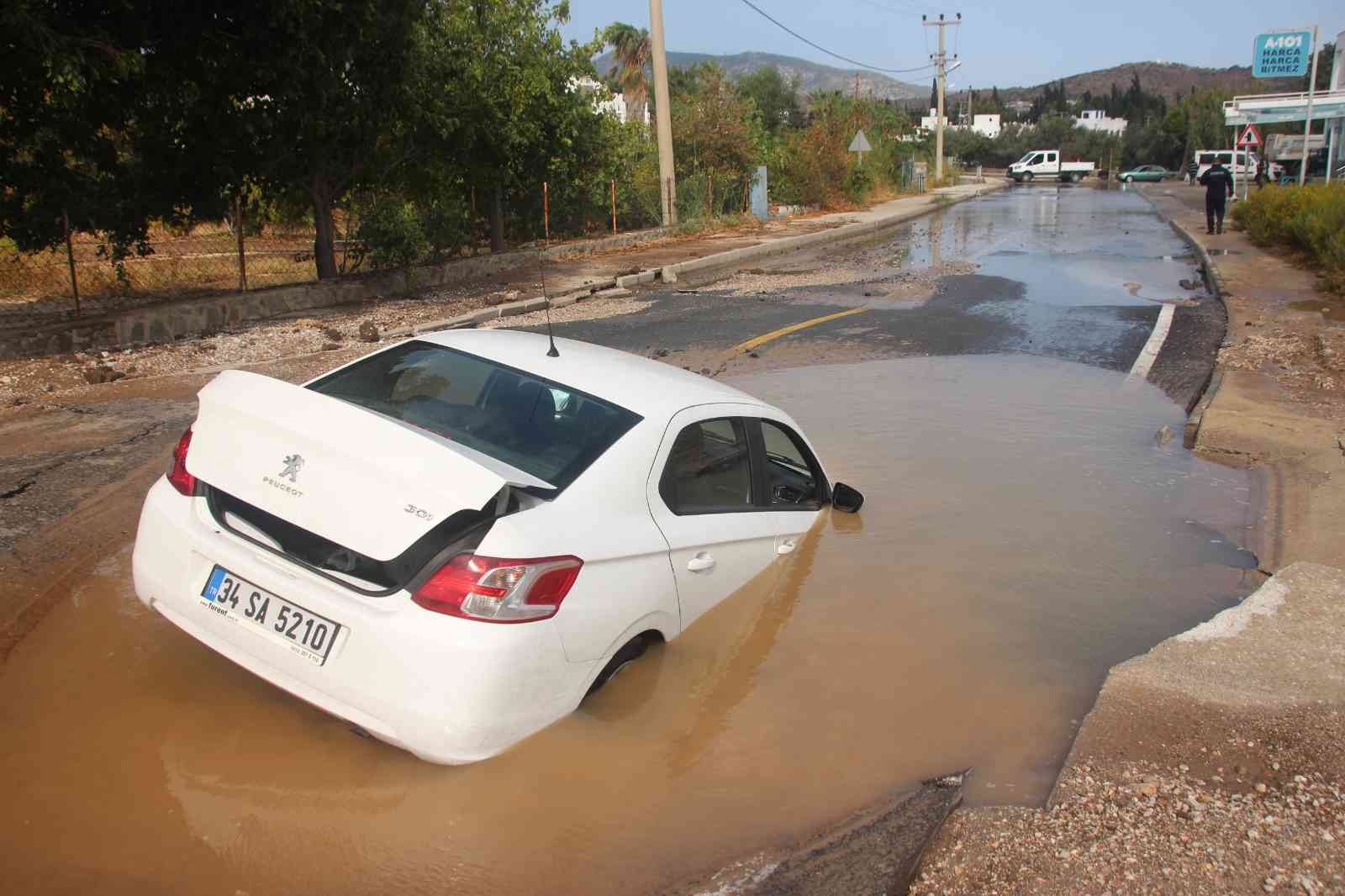 Muğla'nın Bodrum ilçesinde patlayan isale hattı sonrası yol çöktü, cadde ve sokaklar göle döndü. Yolda oluşan çukura giren otomobildeki 2 kişi kurtarıldı.