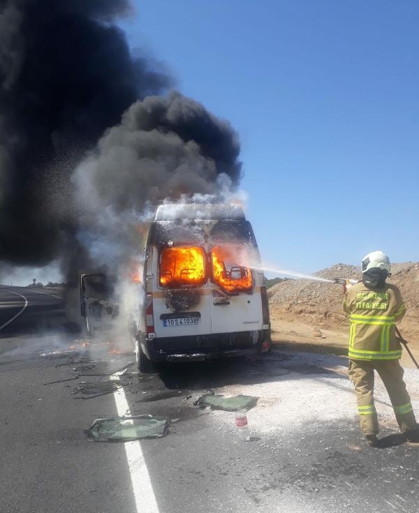 Balıkesir'deki bir fabrikadan saat 12.30 sıralarında çıkan işçileri alarak evlerine bırakmak üzere yola çıkan Ferhat Güven'in (55) kullandığı 10 S 41038 plakalı servis minibüsünün motor kısmından Balıkesir - Savaştepe kara yoluna geldiğinde dumanlar yükselmeye başladı. Güven aracı yolun sağına çekip, içindeki 6 işçiyi tahliye etti. Ardından da motor kısmındaki yangına müdahale etmek için kaputu açmak istedi. Ancak, başaramadı. Kısa süre sonra tüm minibüsü alevler sardı. İhbar üzerine olay yerine itfaiye ekipleri sevk edildi. İtfaiye ekipleri, su sıkarak alevleri söndürürken, minibüs kullanılmaz hale geldi. (DHA)
