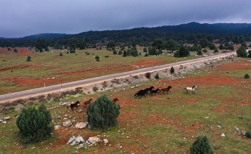 Bölgedeki tota yaylasına ulaşırken kullanılan yol üzerinde yılkı atları görülebiliyor.