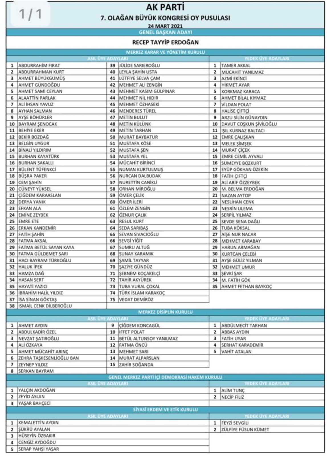 AK Parti’nin 7’nci olağan kongresinde Cumhurbaşkanı ve AK Parti Genel Başkanı Recep Tayyip Erdoğan’ın Merkez Karar ve Yönetim Kurulu (MKYK) listesi belli oldu.