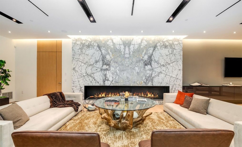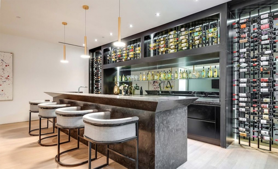 Salonda bir şömine bulunduğu belirtilirken evin içerisinde ayrı bir bar yer alıyor. Bar içerisinde iki adet mini buzdolabı, şarap rafı ve bulaşık makinesi bulunuyor. Mutfağın bazı noktalarında da özel bir tasarımcı tarafından geliştirilen paslanmaz çelik kullanıldığı belirtilirken zeminden-tavana kayan cam kapılar sayesinde manzaranın evin her yerinden görüldüğü vurgulanıyor.