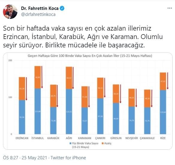 Vaka sayılarının azaldığı illeri açıklayan Bakan Koca, "Son bir haftada vaka sayısı en çok azalan illerimiz Erzincan, İstanbul, Karabük, Ağrı ve Karaman. Olumlu seyir sürüyor. Birlikte mücadele ile başaracağız" dedi.