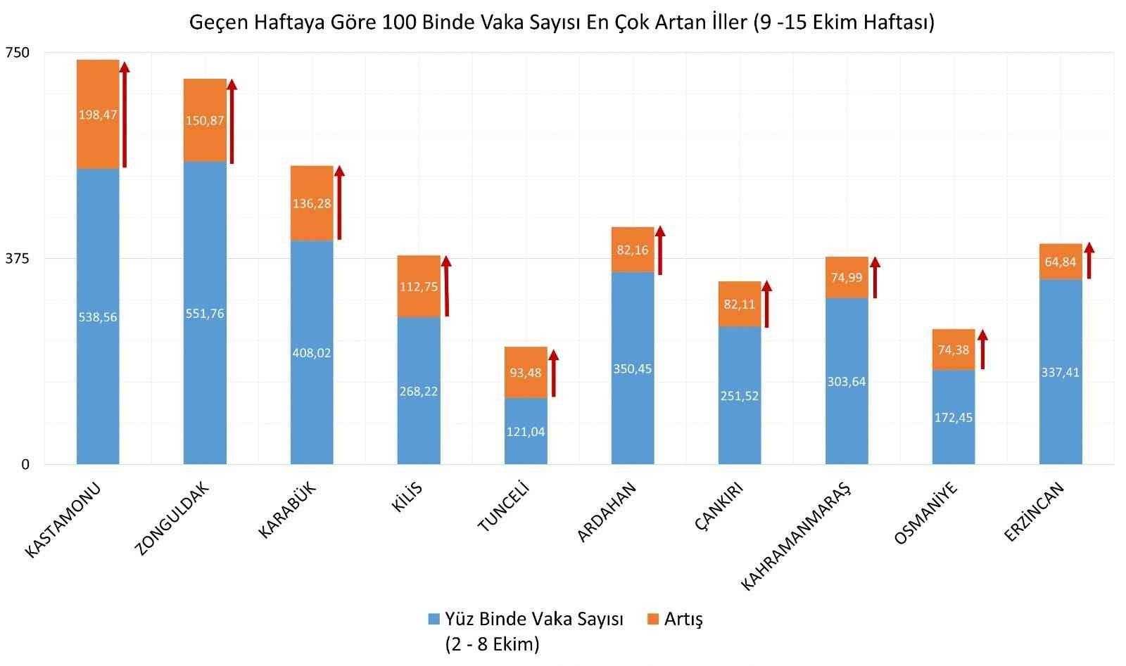 "9-15 Ekim arasında vaka yoğunluğu bir önceki haftaya göre en çok artan 10 ilimiz: Kastamonu, Zonguldak, Karabük, Kilis, Tunceli, Ardahan, Çankırı, Kahramanmaraş, Osmaniye, Erzincan."