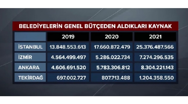 İstanbul, Ankara, İzmir başta olmak üzere muhalefet belediyelerine bütçeden ayrılan paylar 2019'dan bu yana iki kat artırılmıştır. AK Parti ve MHP belediyelerindeki artış aynı orandadır.