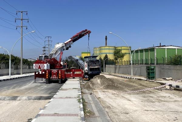 MANİSA Organize Sanayi Bölgesi (MOSB) 2'nci kısımda dün patlayan doğal gaz borusunun basıncı ile asfalt kazıma makinesi devrildi. Patlama anı kameralara yansırken, 2 işçinin son anda kaçarak kurtulduğu görüldü.