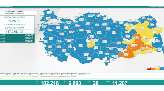 Sağlık Bakanlığı'nın açıkladığı 'Günlük Kovid- 19 Tablosu' verilerine göre; son 24 saatte yapılan 182 bin 216 testte 6 bin 893 vaka tespit edildi. Koronavirüs nedeniyle 28 kişi hayatını kaybederken, 11 bin 207 kişinin de tedavisi ve karantinası sona erdi. 18 yaş ve üzeri nüfusun aşılanması verilerinde 1'inci doz Türkiye ortalaması yüzde 93,11, 2'nci doz ortalaması yüzde 85,39 olarak belirlendi. Ayrıca 1'inci dozda 57 milyon 796 bin 702, 2'nci dozda 53 milyon 2 bin 640 ve 3'üncü dozda 27 milyon 689 bin 204 olmak üzere 147 milyon 235 bin 102 aşı uygulandı.
