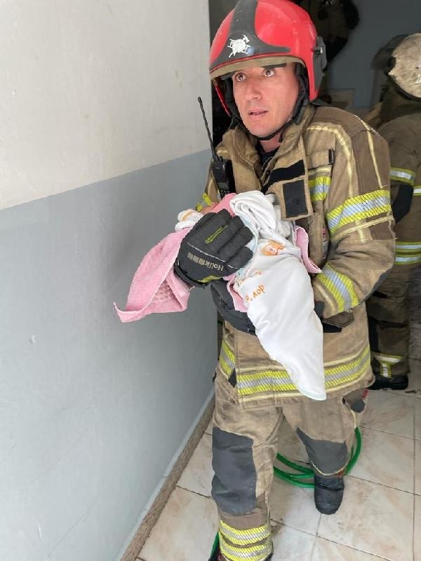 Buca'nın Çamlıkule Mahallesi'nde geçen hafta bir apartmanda çıkan yangın alt katları sarınca 4'üncü katta yaşayan Havva Araz ve 1,5 aylık bebeği Zümra Nehir dumanlar arasında mahsur kaldı. İtfaiye personellerinden Yiğit Özer, Zümra Nehir'i evden alarak, dışarı çıkardı.