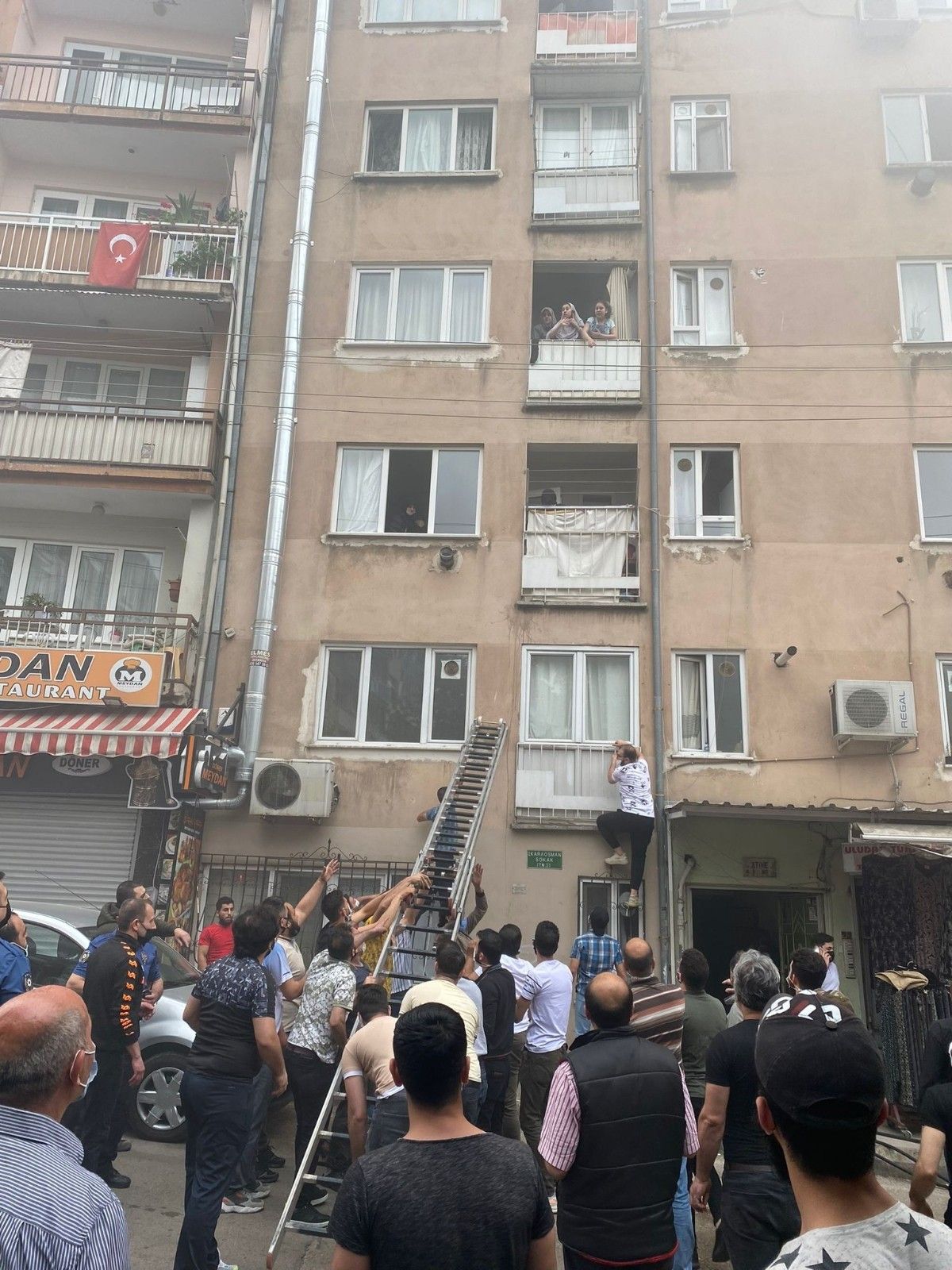 Bursa'da yabancı uyruklu vatandaşların yaşadığı 6 katlı apartmanda çıkan yangına müdahale etmek isteyen itfaiye ekiplerini bıçakla tehdit etti. Yoğun dumandan etkilenen 2'si çocuk 4 kişi hastaneye kaldırıldı.