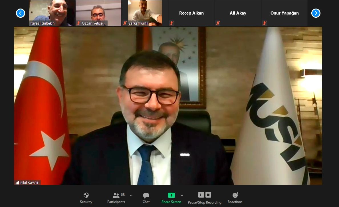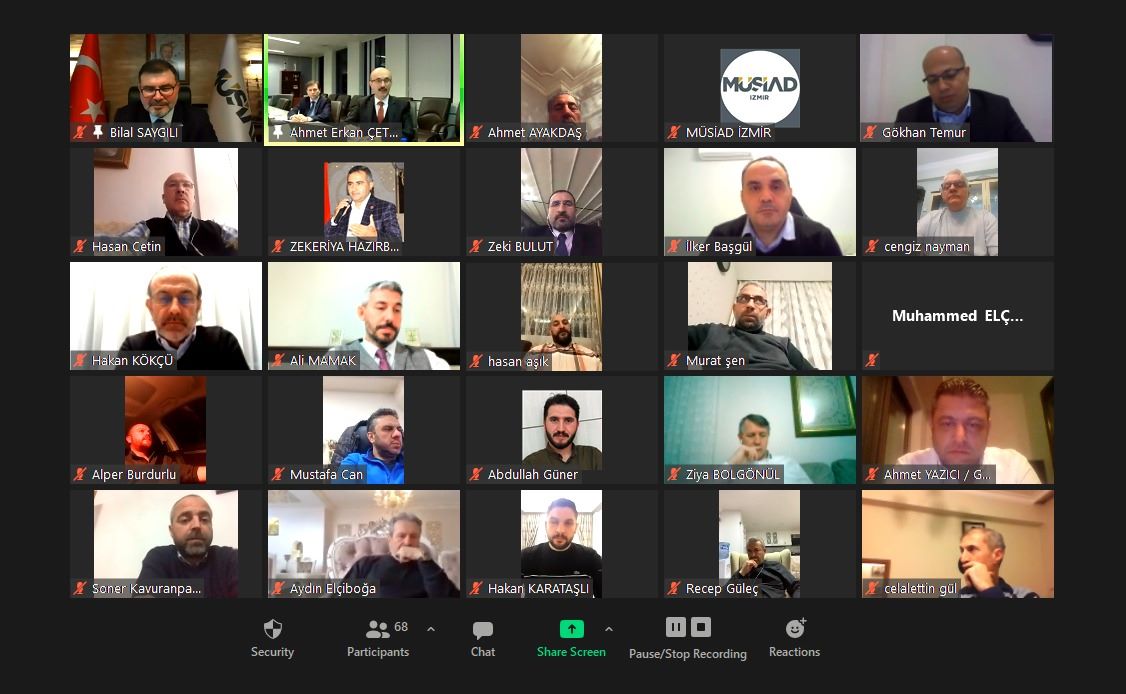 Müstakil Sanayici ve İşadamları Derneği (MÜSİAD) İzmir Şubesi, Başkan Bilal Saygılı başkanlığında gerçekleştirilen Dost Meclisi video konferans toplantısında T.C. Ticaret Bakanlığı İthalat Genel Müdürü Ahmet Erkan Çetinkayış ve Genel Müdür Yardımcısı Murat Gören’i misafir etti.