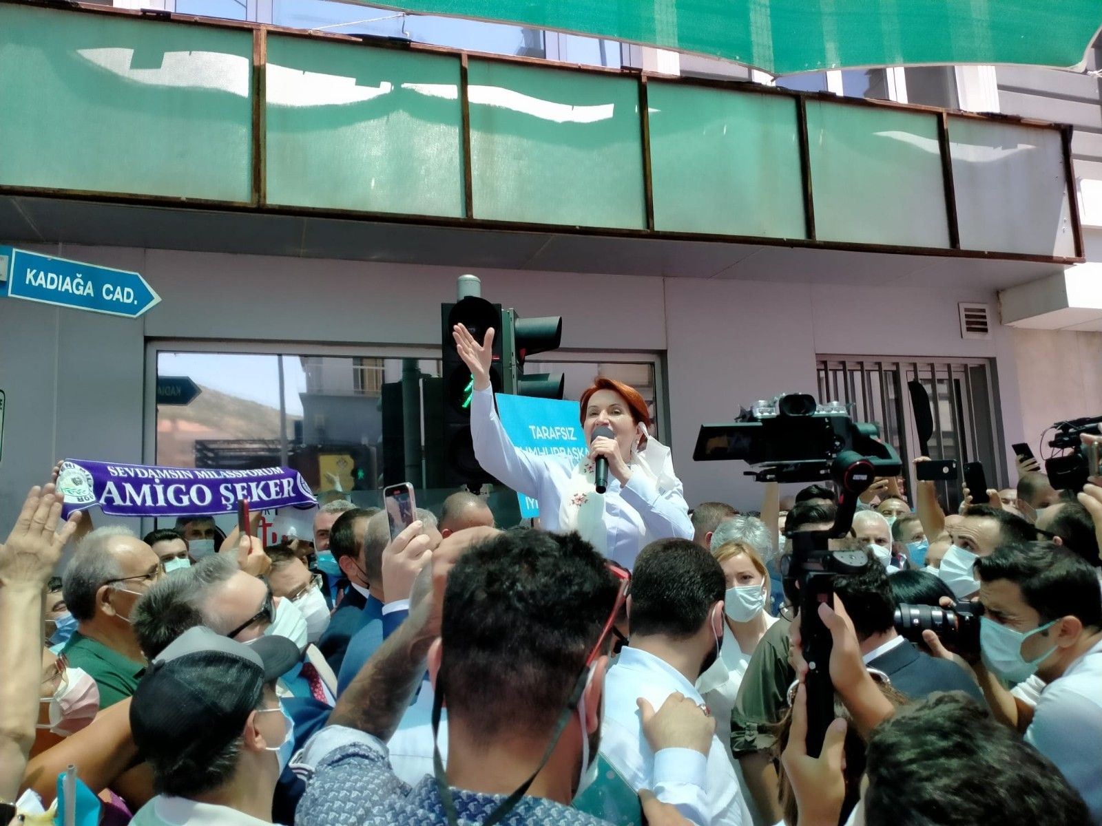 Kadıağa Caddesi üzerinde bulunan esnafı ziyaret ederek, özellikle pandemi sürecindeki sıkıntılarını dinleyen Genel Başkan Akşener; "Buraya bugün oy istemeye, siyaset yapmaya, partimin propagandasını yapmaya gelmedim. Bugün arkadaşlarımla birlikte sizleri ziyaret ederek, sorunlarınızı, sıkıntılarınız dinlemek ve ülkeyi yönetenlere bunları aktarmak için buradayım. Nasıl ki esnaf için müşteri velinimet ise, seçmen de siyasetçi için aynıdır. Oylarınız artık midenizdedir. Oradan onu çıkarmak kolay değildir, kolay da olmamalıdır. Yarın seçim zamanı kim gelirse gelsin, oy istediği zaman sizin için ne yapacağını sorun. Bulunduğunuz, yaşadığınız yerle ilgili hangi projelerinin olduğunu sorun. Kısaca hesap sorun" diyerek söze başladı ve sonrasında esnafın kendisine aktardıklarını dinledi.