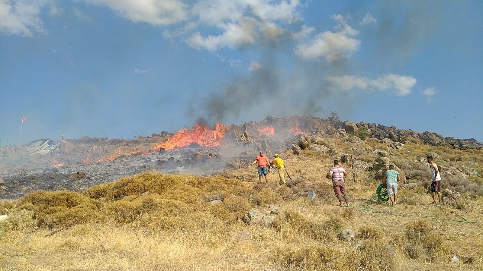 İzmir'in Dikili ilçesinde hayvan damlarının da bulunduğu makilik alanda çıkan yangın ekiplerin çalışmasının ardından kontrol altına alındı. İzmaritten çıktığı öne sürülen yangında yaklaşık 18 dönüm arazi kül oldu.