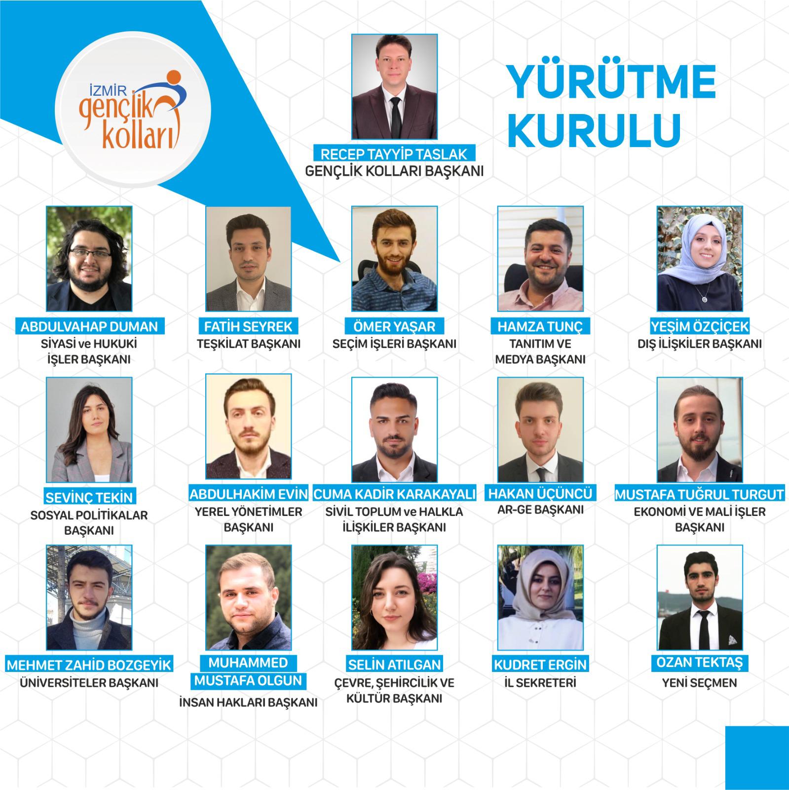 İzmir Gençlik Kolları İl Başkanı Recep Tayyip Taslak, 15 kişiden oluşan yürütme kurulunu paylaştı.