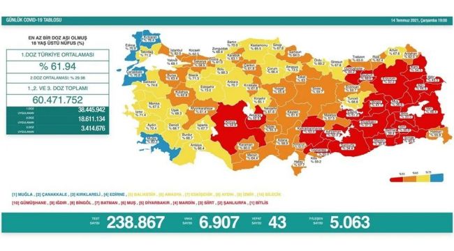 Sağlık Bakanlığı tarafından Türkiye'nin yeni korona virüs tablosu açıklandı. 14 Temmuz'da açıklanan 24 saatlik verilere göre 6 bin 907 vaka tespit edildi. Virüs nedeniyle hayatını kaybedenlerin sayısı 43 oldu. Bir günde toplam 238 bin 867 test yapılırken, iyileşen hasta sayısı 5 bin 63 olarak kaydedildi. Sağlık Bakanlığı tarafından açıklanan tabloda, aşılama verilerine de yer verildi. En az 1 doz aşı olmuş 18 yaş üzeri nüfusu kapsayan verilere göre Türkiye'de 1. doz aşılama ortalama yüzde 61,94 oldu. 2. doz ortalaması yüzde 29,98 olurken, 1., 2. ve 3. doz aşısını olan vatandaş sayısı toplamda 60 milyon 471 bin 752'a yükseldi.