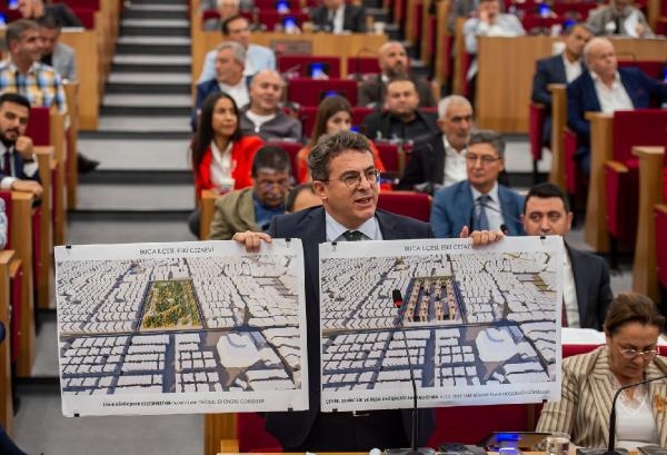 Süreçle ilgili teknik bilgilendirme yapan CHP Grup Başkan Vekili Murat Aydın, Çevre, Şehircilik ve İklim Değişikliği Bakanlığı'nın hazırladığı planda yeşil alanların azaldığını ve betonlaşmanın arttığını aktardı. AK Parti ve MHP gruplarından gelen eleştirilere cevap veren ve İzmir Büyükşehir Belediyesi'nin alan için hazırladığı tasarıyı da örnek gösteren Aydın, iki planın görsellerini kamuoyuna sundu. Büyükşehir Belediyesi'nin planlarının Buca'nın yeşil alanını arttıracağını vurgulayan Aydın, 'Atı alan Üsküdar'ı geçti' diyorlar. Atı aldılar ama Üsküdar'a varmadılar. 'Devletle çatışılmaz' dediler. Bu 14'üncü Louis'in anlayışıdır. Bugünün anlayışı değildir. Devlet sadece siz değilsiniz. Devlet herkes. 'Buca'ya 70 bin metrekare inşaat yapmak istiyoruz, biz betonu seviyoruz' diyorsanız çıkın Buca halkına söyleyin. Bunu açık yüreklilikle söyleyin" dedi. Aydın, Büyükşehir planlarını kastederek, "Biz ve İzmir halkı bunu istiyor. Sözün özü budur" diyerek sözlerini tamamladı.