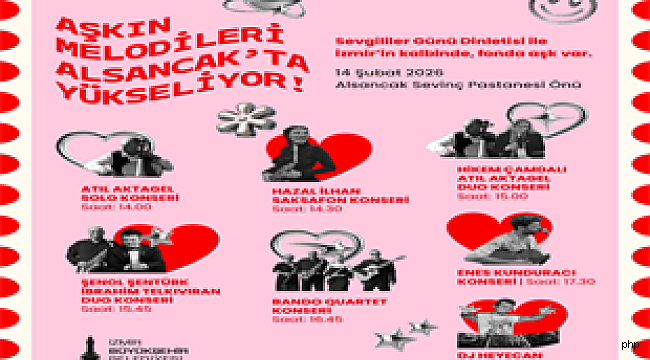 14 Şubat Sevgililer Günü, İzmir Büyükşehir Belediyesi tarafından Alsancak Kıbrıs Şehitleri Caddesi girişinde önünde müzikle kutlanacak. Saat 14.00’te başlayacak programda Atıl Aktagel, Hazal İlhan, Hikem Çamdalı-Atıl Aktagel, Şenol Şentürk-İbrahim Telkıvıran, Bando Quartet, Enes Kunduracı konserleri yapılacak. Saat 18.30’da ise DJ Heyecan sahne alacak. Etkinlik ücretsiz olacak.