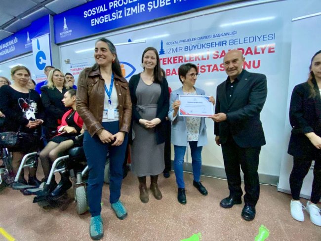 Engelsiz yaşamın öncüsü olabilmek için yola çıkan İzmir Büyükşehir Belediyesi, engelli bireylerin yaşamını kolaylaştırmak için yeni uygulamalara imza atmayı sürdürüyor. Son olarak Konak Center içerisinde Destekli İstihdam Ofisi ile Tekerlekli Sandalye Bakım ve Onarım Merkezi hizmete alındı. İzmir Büyükşehir Belediye Başkanı Tunç Soyer’in ev sahipliğinde düzenlenen açılışa İzmir Büyükşehir Belediyesi Genel Sekreter Yardımcısı Ertuğrul Tugay, Engelsizmir Yürütme Kurulu Başkanı Doç. Dr. Levent Köstem, Uluslararası Göç Örgütü İzmir Ofis Sorumluları Pınar Genç Akçakaya, Cassandra Gallese ve Ayşe Kaplan ile Engelsizimir Yürütme Kurulu üyeleri, belediye bürokratları, sivil toplum kuruluşları, muhtarlar ve yurttaşlar katıldı. Destekli İstihdam Ofisi engelli bireylerin iş hayatına katılımını kolaylaştıracak. Tekerlekli Sandalye Bakım ve Onarım Merkezi ise tekerlekli sandalye kullanan engellilerin sandalyelerinin arızalanması durumunda acil müdahale sağlayabilecek.