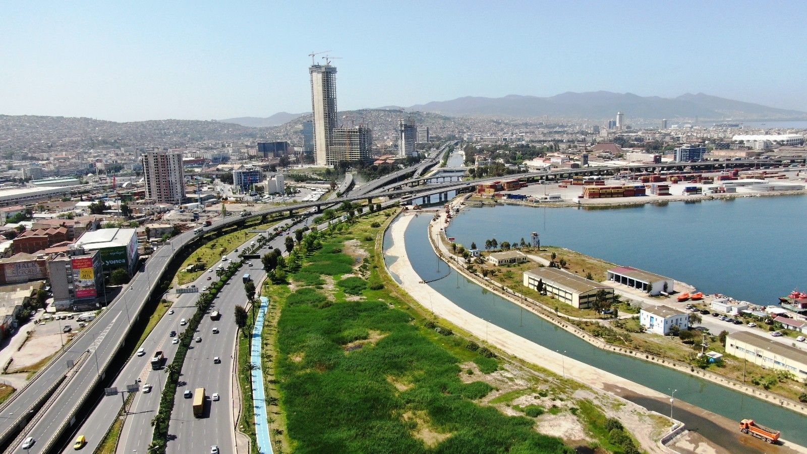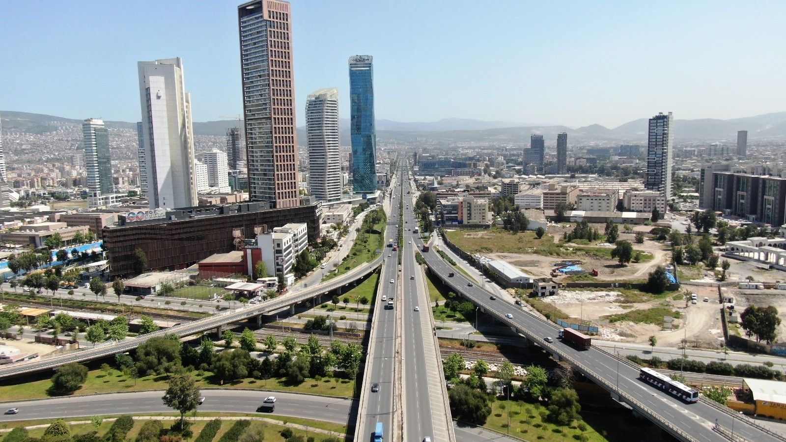 İzmir'de kuzey ve güney ilçeleri birbirine bağlayan önemli kavşaklar ile kentin önemli ana arterlerinden Anadolu Caddesi ve Ankara Caddesi drone ile havadan görüntülenirken, trafik akışının normal seviyelerin altında olduğu görüntülere yansıdı.