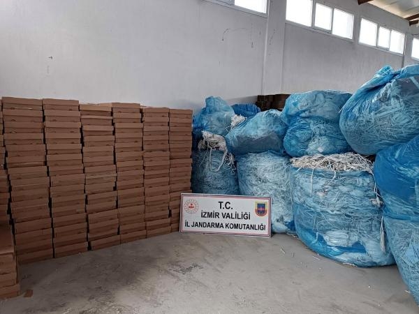İZMİR'in Torbalı ilçesinde, jandarma ekiplerince düzenlenen baskında 1,5 ton kaçak tütün ve 2 milyon 200 bin sigara filtresi ele geçirildi, 3 kişi gözaltına alındı.