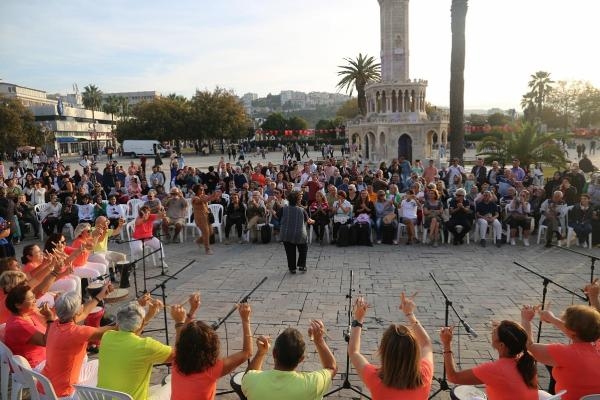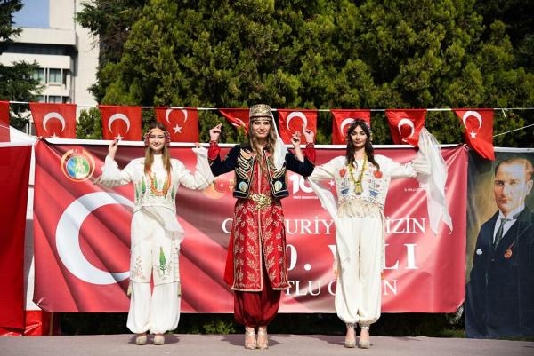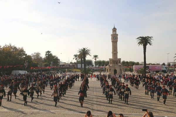 İZMİR İl Milli Eğitim Müdürlüğü tarafından Cumhuriyetin 100'üncü Yılı Kutlamaları kapsamında Konak Meydanı'nda bir dizi etkinlik gerçekleştirildi. Kentteki ilçe halk eğitim merkezleri tarafından yapılan '100. Yılda 100 Zeybek Gösterisi' ilgi görürken, el tezgahlarında dokunan yerli ve kumaşların yanı sıra ipekli ve kadife kumaşlar üzerine el işçiliği ile işlenen geleneksel motiflerin yer aldığı kıyafetlerden oluşan 'Cumhuriyetin 100'üncü Yılı Defilesi' beğeni topladı.