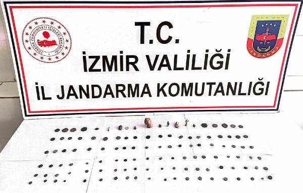 İZMİR'in Menemen ilçesinde jandarma ekiplerince Osmanlı, Roma ve Bizans dönemine ait 120 parça tarihi eser ele geçirildi.