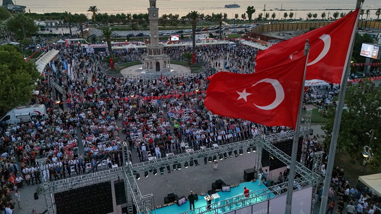 İzmir'de 15 Temmuz Demokrasi ve Milli Birlik Günü'nde gerçekleşen etkinlikte Konak Meydanı vatandaşlar tarafından dolduruldu. Binlerce İzmirlinin tek yürek olduğu etkinlikte 15 Temmuz şehitleri anıldı.
