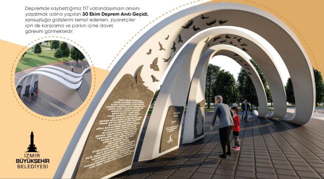 Bir anıt geçidi niteliği taşıyan 30 Ekim Deprem Anıtı'nın başlangıç noktasında üç pano bulunuyor. Bu panolarda depremin olduğu tarih ve saat ile kaybettiğimiz 117 kişinin isimleri yer alıyor. İsimlerin yazılı olduğu panolarda kuş figürleri yer alıyor. Bu figürler kaybedilen vatandaşların sonsuzluğa uçuşlarını temsil ediyor. Parkın girişine konumlandırılan anıt geçidi, karşılama ve parkın içine davet görevini de üstleniyor.