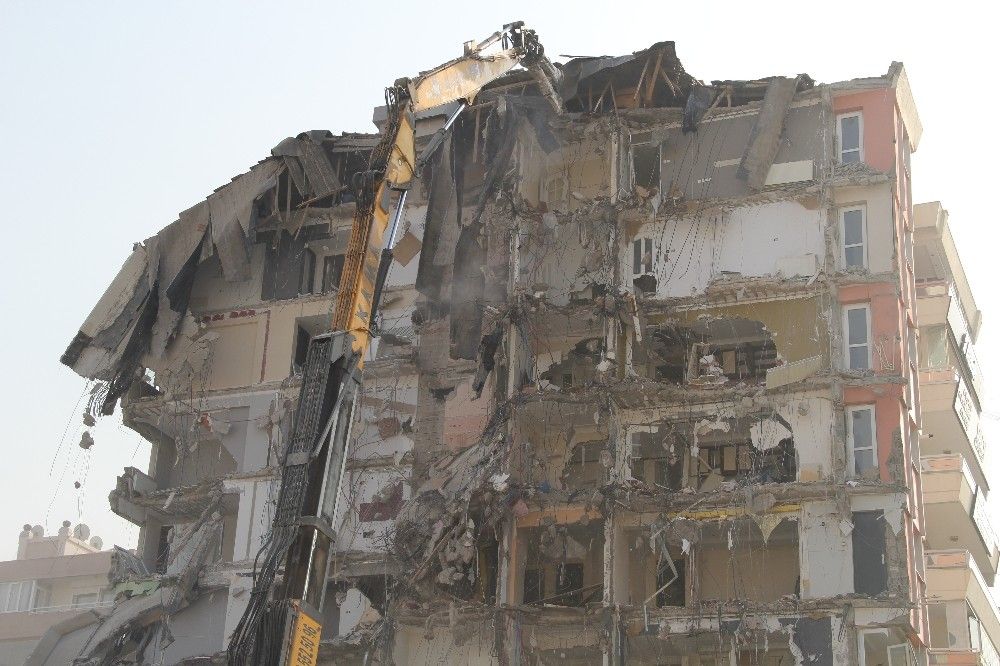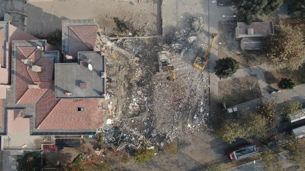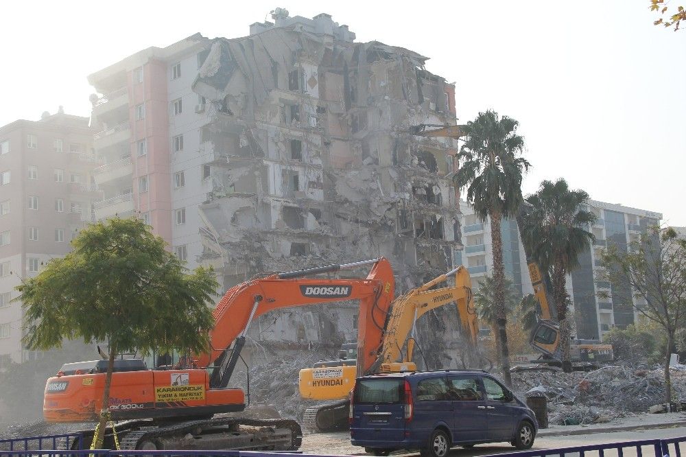 Ağır hasarlı binaların yıkım çalışmaları, deprem bilançosunun en ağır olduğu apartman olan Rıza Bey Apartmanının çevresinde de sürüyor. 34 kişinin hayatını kaybettiği apartmanın enkazı, depremin ardından geçen 6. günde tamamen kaldırılabilmişti.