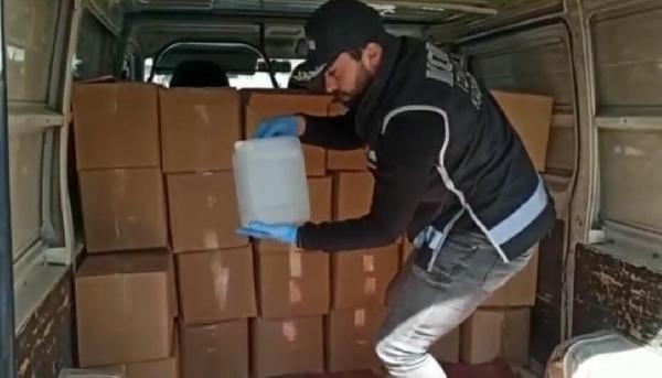 İzmir'in 8 ilçesinde polisin düzenlediği operasyonda 10 bin 802 litre etil alkol, 1135 adet içki aroması, 99 şişe sahte içki, 70 litre açık sahte içki ve sahte alkol imalatında kullanılan malzemeler ele geçirildi, 3 kişi gözaltına alındı.