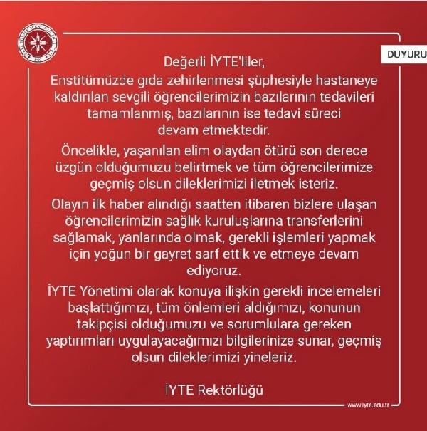 Konuyla ilgili sosyal medya hesabından paylaşım yapan İYTE Rektörü Prof. Dr. Yusuf Baran, "Gıda zehirlenmesi şüphesiyle tedavi altına alınan değerli İYTE'lilere geçmiş olsun diyor; konunun takipçisi olduğumuzu, gerekli tüm önlemleri aldığımızı ve yapılacak inceleme sonucuna göre sorumlulara gerekli yaptırımları uygulayacağımızı bilgilerinize sunuyoruz" dedi.