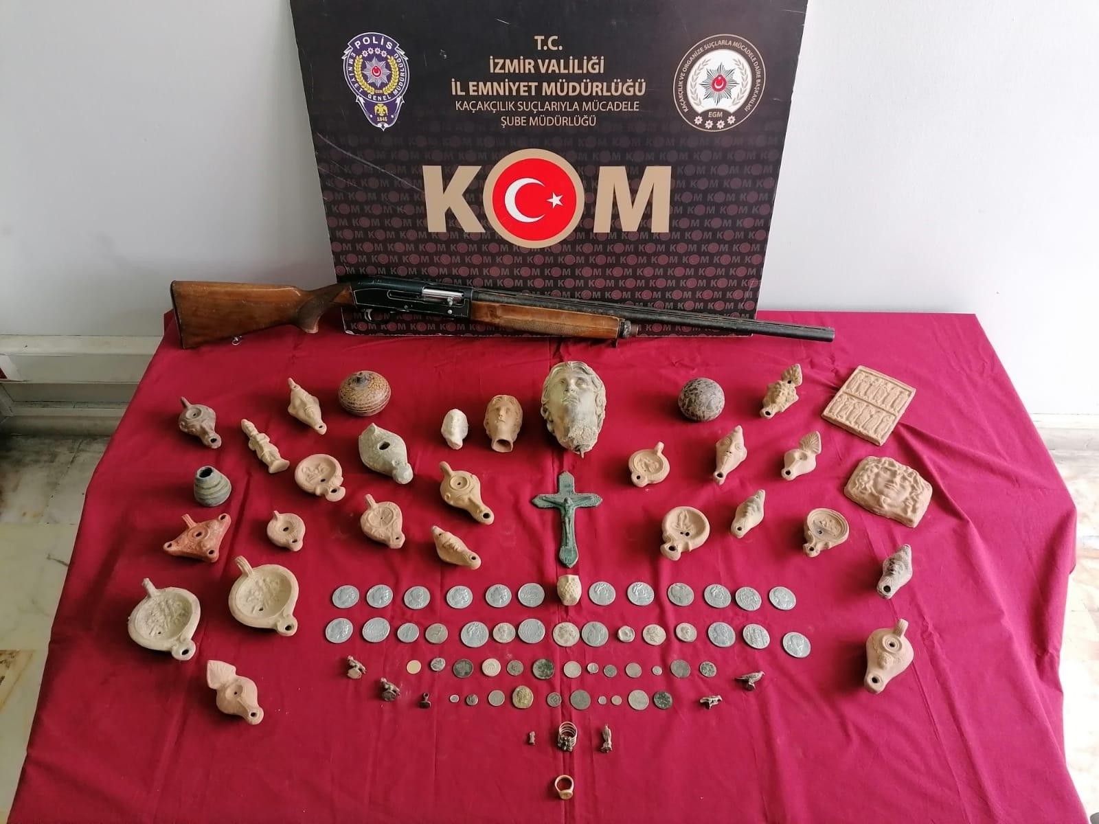 İl Emniyet Müdürlüğü Kaçakçılık Suçlarıyla Mücadele Şube Müdürlüğü ve Selçuk İlçe Emniyet Müdürlüğü ekipleri, ilçede tarihi eser kaçakçılığı yapıldığı bilgisi üzerine çalışma başlattı. Harekete geçen ekipler tarafından önceden belirlenen adrese operasyon düzenlendi. Operasyonda Arkaik, Helenistik, Roma ve İslami dönemlere ait 50 adet gümüş ve bronz sikke, 20 adet pişmiş toprak kandil, 5 adet insan başı heykel, 2 adet yüzük, 6 adet metal minyatür kuş heykeli, 1 adet mühür, 2 adet minyatür obje, 1 adet minyatür kap, 1 adet taş ağırlık, 1 adet baykuş tasvirli heykel, 2 adet insan kabartmalı pişmiş toprak levha olmak üzere toplam 91 adet tarihi eser ve 1 adet ruhsatsız tüfek ele geçirildi. Operasyonda 2 şüpheli de yakalanarak gözaltına alındı. Şüphelilerin emniyetteki işlemlerinin sürdüğü öğrenildi.