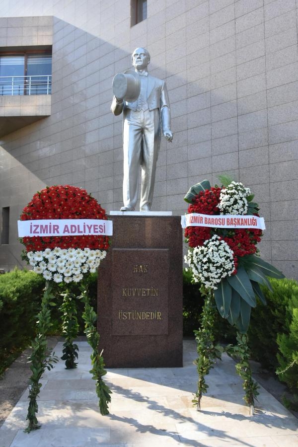 İZMİR Adliyesi'nde 2022-2023 Adli Yıl Açılışı Töreni düzenlendi. Adliye girişindeki Atatürk büstüne çelenk sunumuyla başlayan tören, saygı duruşu ve İstiklal Marşı'yla sürdü. Törene İzmir Cumhuriyet Başsavcısı Mustafa Öztürk, İzmir Adli Yargı İlk Derece Mahkemesi Adalet Komisyon Başkanı Oktay Tabur, İzmir Barosu Başkanı Özkan Yücel, adliyede görevli hakim, savcı ve avukatlar katıldı. İzmir Cumhuriyet Başsavcısı Mustafa Öztürk ise, Türkiye Cumhuriyeti Devleti'nin çok zor şartlar altında kurulduğuna dikkat çekip, "Geçmişte görev yapmış olan, şehadete eren tüm arkadaşlarımızı rahmetle yad ediyorum. Bu devleti kuran Mustafa Kemal Atatürk ve silah arkadaşlarını rahmetle anıyorum. Sorunlarımız ve sıkıntılarımız var ama empati yapmak çok önemli. Herkes kendi evinin önünü süpürsün. Biz yargının temel unsurlarıyız. Sorumluluğu hep karşı tarafa yükleyerek bir şey elde edilemez. Adaletin tecellisini sağlamak en büyük görevimizdir" dedi.