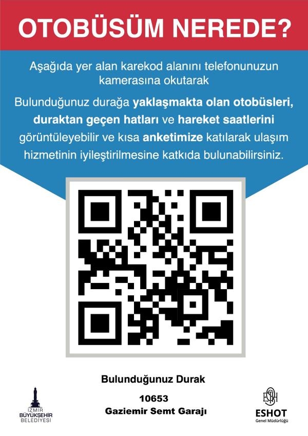 İzmir Büyükşehir Belediyesi ESHOT Genel Müdürlüğü Bilgi İşlem Dairesi Başkanlığı'nın geliştirdiği yazılım, duraklarda bekleyen vatandaşlar için büyük kolaylık sağlayacak. Yolcular, kapalı ve raket duraklara uygulanacak etiketlerde bulunan karekodları akıllı telefonlarının kamerasıyla okutarak, bulundukları durağa yaklaşmakta olan otobüsleri, duraktan geçen hatları ve hareket saatlerini görüntüleyebilecek. Ayrıca aynı karekod üzerinden Yolcu Memnuniyet Anketi'ne de ulaşılabilecek. Böylece yurttaşlar, 10 sorudan oluşan ankete katılarak, ESHOT hizmetinin kalitesini daha da artırma çalışmalarına katkıda bulunabilecek.