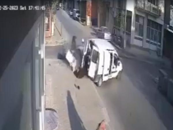 İZMİR'in Bornova ilçesinde otomobille çarpışan hafif ticari araç, savrulup, kaldırımda yürüyen yayaların arasına daldı. 2'si ağır 4 kişinin yaralandığı kaza, güvenlik kamerasına yansıdı. Hafif ticari araç sürücüsünün 17 yaşında olduğu öğrenildi.