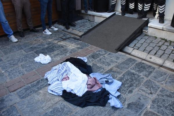 S plaka için ödedikleri paraların geri verilmesini değil plakalarını istediklerini belirten grup, kıyafetlerini çıkarıp belediye binasının önüne atarak, "Bizi böyle don, gömlek, atlet bıraktılar" diye bağırarak tepkilerini dile getirdi. (DHA)