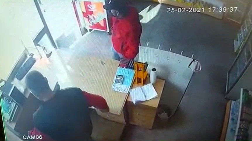 Öte yandan benzin istasyonunun marketindeki soygun anı, iş yerinin güvenlik kamerası tarafından görüntülendi. Görüntülerde kırmızı ceketli, şapkalı ve yüzü maskeli soyguncunun elinde beze sararak gizlediği pompalı tüfekle markete girdiği, burada market çalışanı ile konuştuğu ve daha sonra tüfeği kendisine doğrultarak kasadaki paraları istediği görüldü. Görüntülerde, market çalışanının kasadaki paraları çıkardığı an da yer aldı.