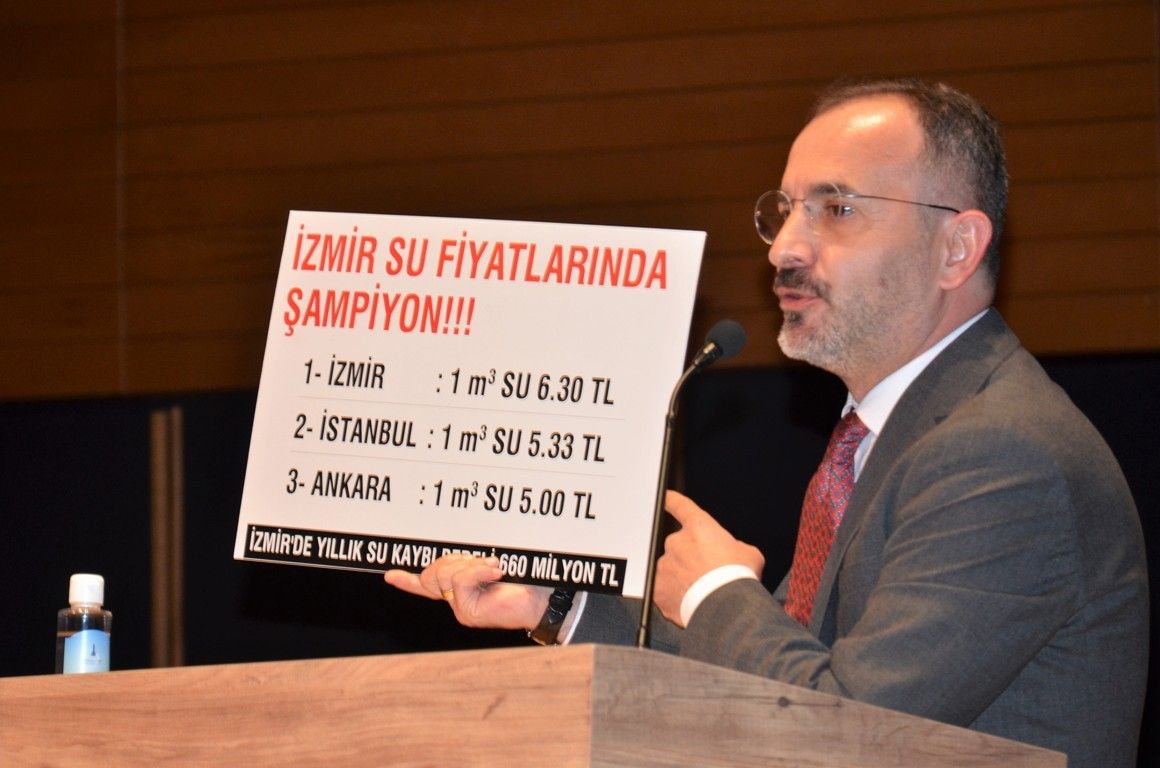 "İzmirliler, 2019 31 Mart sonrası musluklarından akan suyu içme hayaline kapılmışken bambaşka gerçekle karşılaştılar. İzmir'in suyundan içen tek kişi herhalde Sayın Özuslu oldu. Geçmiş zamanlarda burada musluktan su içmişti ve sağlığından endişe etmiştik. İzmirliler, musluk suyu içmeyi hayal ederken, Türkiye'nin en pahalı suyuyla karşılaştılar. Türkiye'de su şampiyonu İzmir. İzmir, su fiyatları ve zamları konusunda şampiyonluğu kimseye bırakmıyor. Yaklaşık üç kez zam yaptınız. Dönem dönem İstanbul şampiyonluğu almak için atak yapıyor ama İstanbul'un meclisinde Cumhur İttifakı ağırlığı söz konusu olduğu için bu atak sonuçsuz kalıyor. Muhtemelen haziran ayında da bir zam planlanıyor. Evet girdi fiyatlarında artış var ama o artış başka şehirlerde de olmuş. Su zammı konusundaki en yakın rakibinize 1 lira fark attınız. Girdi fiyatlarını bahane olarak gösterirseniz."