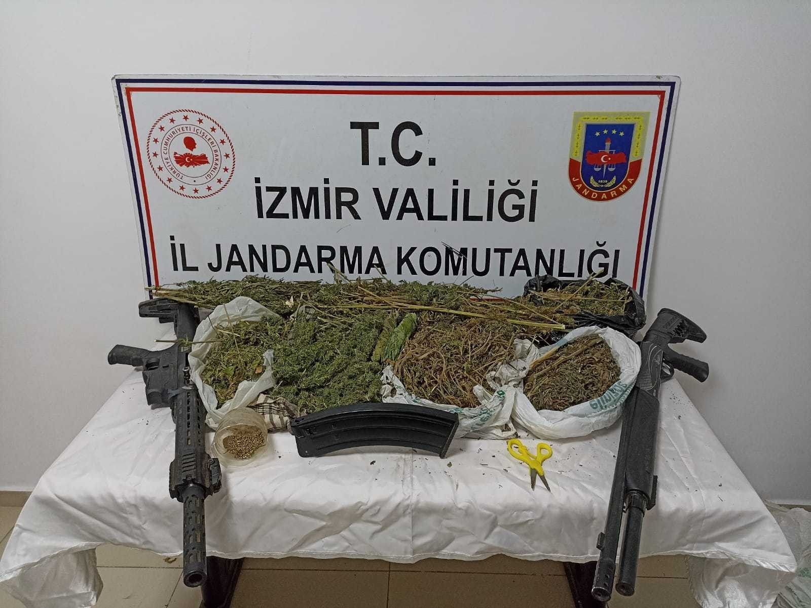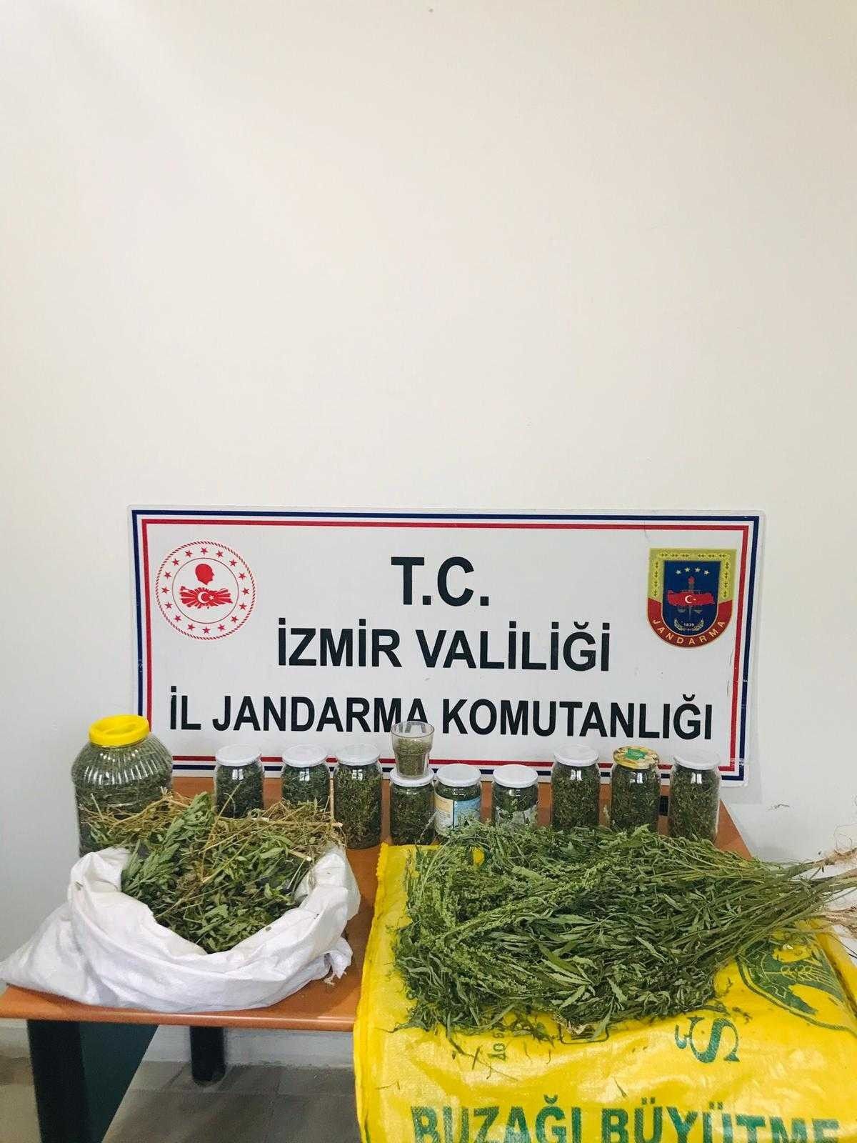 İzmir İl Jandarma Komutanlığı ekipleri, uyuşturucu madde ticareti ve kullanımının önlenmesi maksadıyla 13-21 Eylül 2021 tarihleri arasında Bayındır, Bergama. Beydağ, Karaburun, Kiraz, Ödemiş, Seferihisar, Tire ve Torbalı ilçelerinde operasyonlar gerçekleştirdi. Cumhuriyet Başsavcılıkları koordinesinde, drone destekli ve yaya olarak yapılan keşif faaliyetleri sonucunda yürütülen operasyonlarda, 109,5 kilogram kubar esrar, 13 bin 508 kök Hint keneviri, 42 gram metamfetamin, 2 adet hassas terazi, 6 adet av tüfeği, 122 adet av fişeği, 1 adet ruhsatsız tabanca, 2 adet tabanca/tüfek şarjörü, 41 adet tabanca fişeği, 1 adet işlemeli balta, 80 santimetre uzunluğunda bıçak, 1 adet sustalı bıçak ve 1 adet muşta ele geçirildi.
