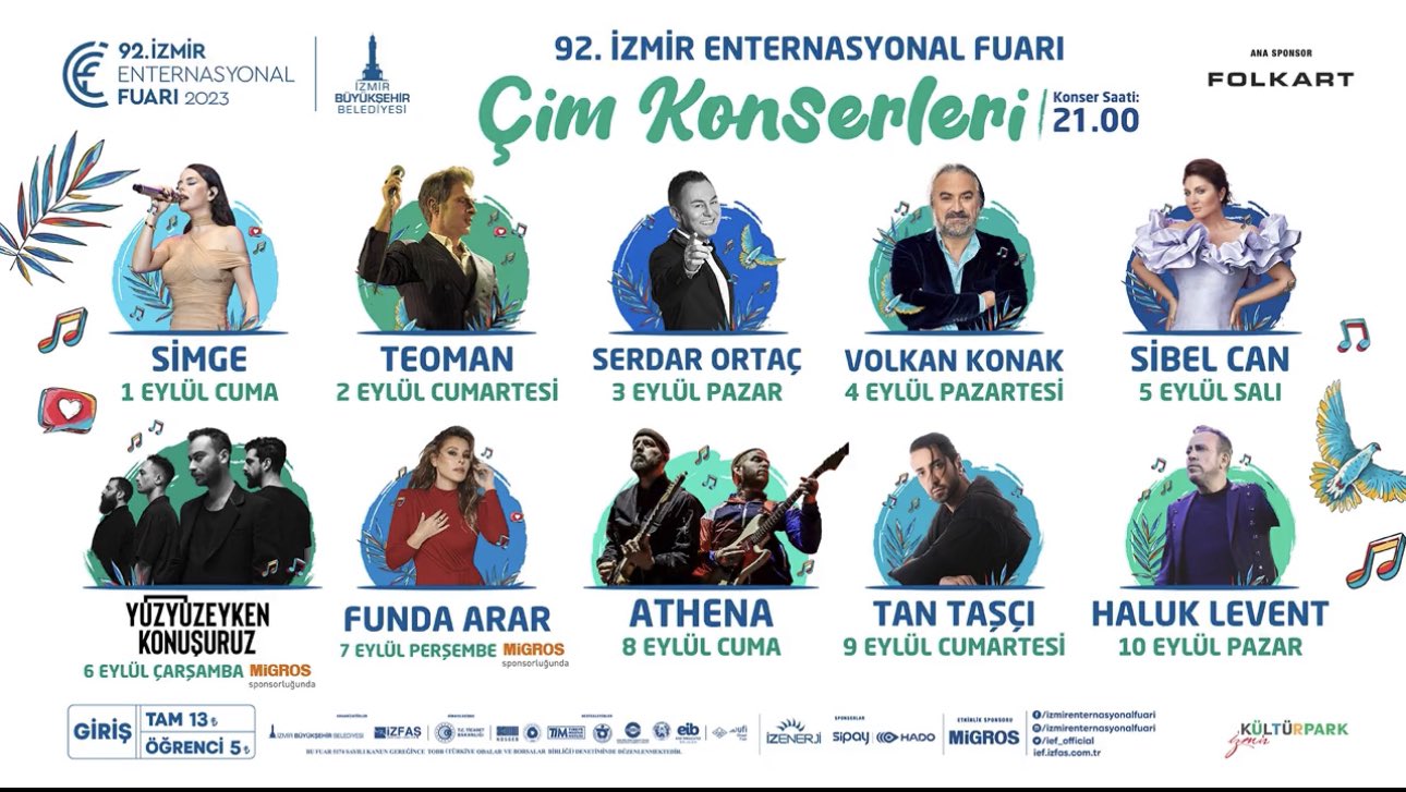 İzmir Fuar'da Çim Konserleri'ne katılacak ünlü isimler belli oldu. Türkiye’nin ilk ve dünyanın en köklü uluslararası fuarlarından biri olan İzmir Enternasyonal Fuarı, İZFAŞ tarafından İzmir Büyükşehir Belediyesi’nin ev sahipliğinde, T.C. Ticaret Bakanlığı himayesinde; 01 – 10 Eylül 2023 tarihleri arasında, İzmir Uluslararası Fuar Alanı / Kültürpark’ta katılımcılarına ve ziyaretçilerine 92. kez merhaba demeye hazırlanıyor.