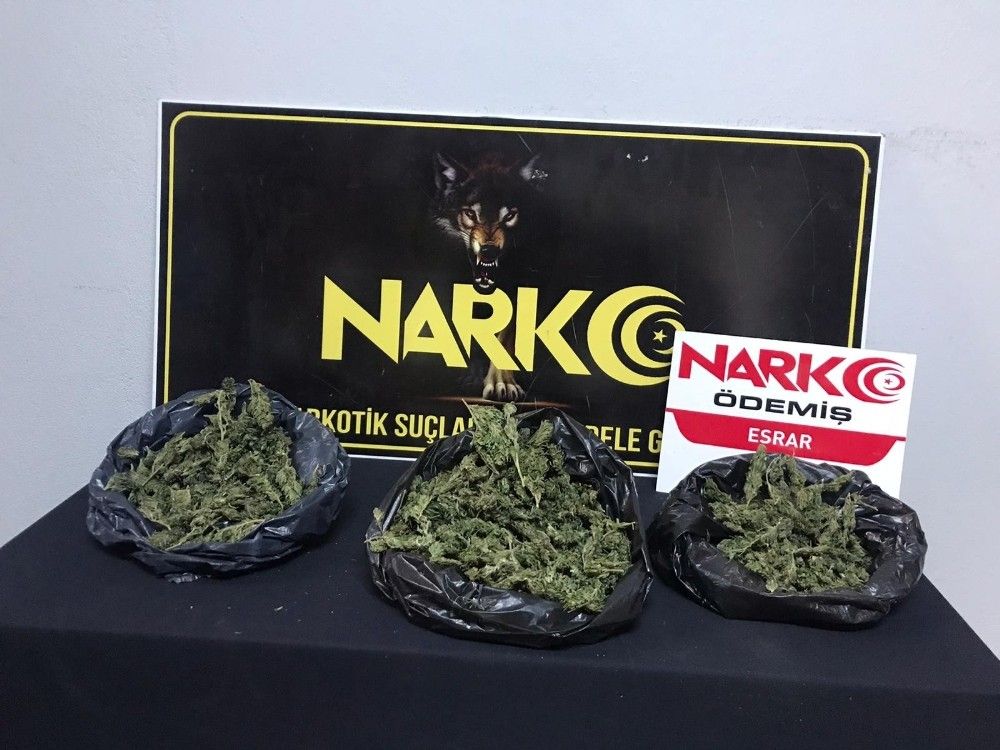 Ödemiş ilçesinde Ödemiş Narkotik Suçlarla Mücadele Grup Amirliği ekipleri de, bir aracın Manisa'nın Alaşehir ilçesinden uyuşturucu madde temin ederek İzmir kent merkezine sevkiyat yapacağı bilgisine ulaştı. Bilgi üzerine harekete geçen ekipler, aracı İzmir - Manisa il sınırında durdurdu. Durdurulan araç içerisinde yapılan aramada 3 ayrı poşet içerisinde toplam 563 gram esrar maddesi ele geçirildi. Olayla ilgili araç içerisinde bulunan M.Ö., N.D. ve F.K. isimli 3 kişi gözaltına alındı.