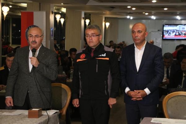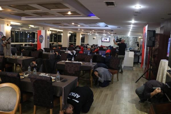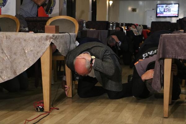 Saatler 18.57'yi gösterdiğinde ise salonda bulunanlar 81 ilde eşzamanlı olarak 'Deprem Anı Çök- Kapan- Tutun' hareketini gerçekleştirdi. İzmir Valiliği himayesinde İzmir İl Afet ve Acil Durum Müdürlüğü koordinesindeki tatbikata Kızılay ve UMKE ile birlikte bünyesinde arama kurtarma ekibi bulunan kamu kurumu, belediye, özel işletme ve sivil toplum kuruluşlarından oluşan toplamda 22 ekip ve 200 personel katıldı. (DHA)